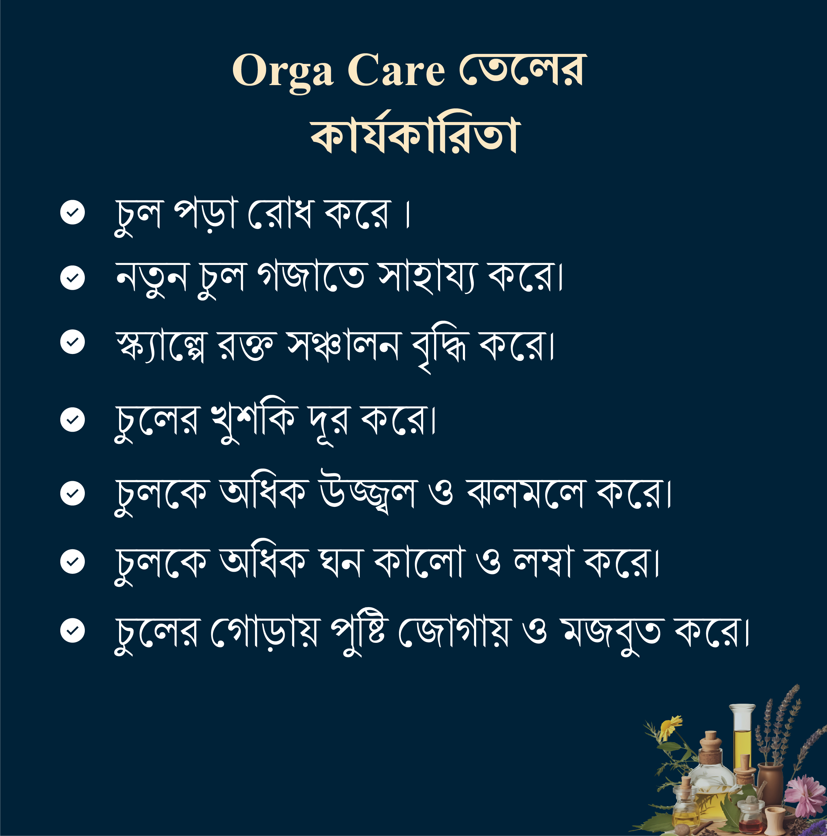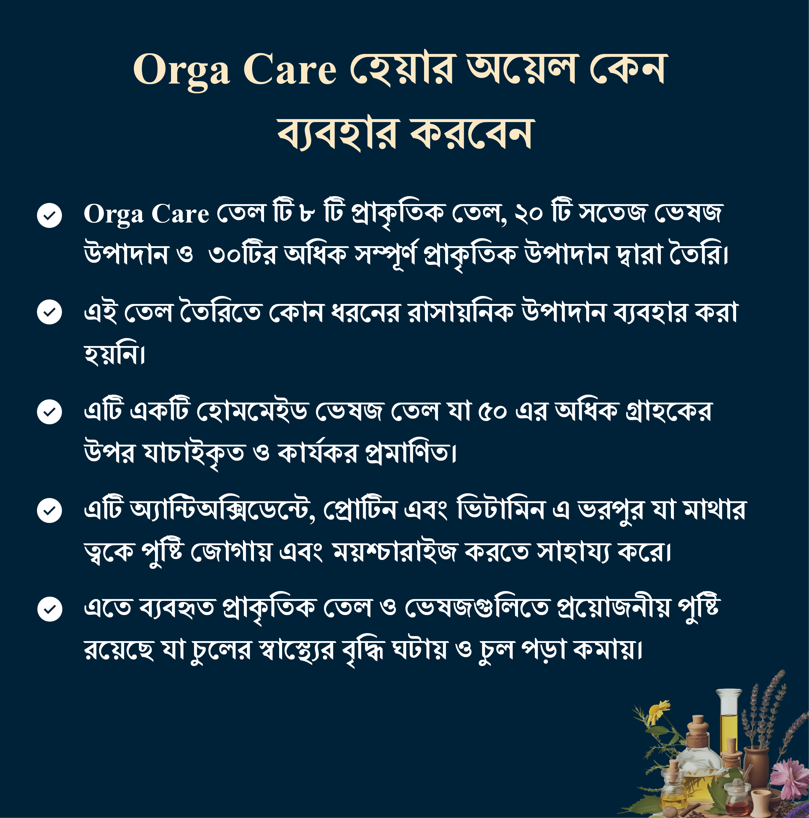 উত্তরঃ Orga Care তেলটি ৫৫ টির অধিক সম্পূর্ণ প্রাকৃতিক ভেষজ উপাদান দ্বারা প্রস্তুত। এর মুল উপাদান আমাদের নিজেদের ভাঙ্গানো বিশুদ্ধ নারকেল তেল, সাথে রয়েছে ক্যাস্টর অয়েল, রোজমেরী অয়েল, আমন্ড অয়েল ও কালোজিরার তেল সহ গুরুত্বপূর্ণ ৮ টি তেল। আরও